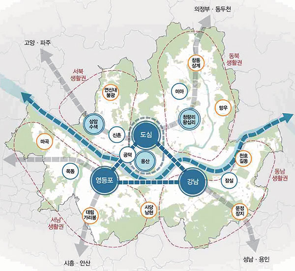 - <2030 서울도시기본계획(2011)>, 구자춘이 개념을 정립한 이후 3핵 도시 구조의 도시계획은 계속 유지되고 있다.