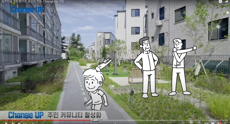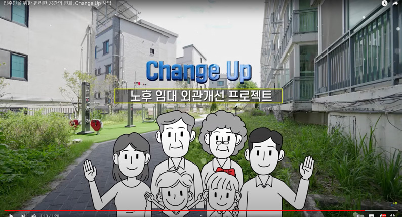 LH는 노후임대주택 단지 외관 개선 사업인 ‘체인지업(Change Up)’을 실시하고 있다. 체인지업은 준공 25년이 지난 영구임대주택을 대상으로 노후시설 장비와 생활편의시설 개선을 지원하는 사업이다. 주요 내용으로는 △주민 커뮤니티 활성화, △미이용 공간을 입주자가 원하는 공간으로 맞춤 조성, △임대주택 이미지 쇄신을 위한 경관 개선, △노후 시설물 교체 및 재정비, △입주자 생활 편의시설 재정비, △저층단지 내 전동휠체어 충전 보관소 도입, △인지 건강을 위한 컬러 유니버설 디자인 적용 등이다. LH는 ‘체인지업(Change Up)’으로 입주민을 위한 편리한 공간으로 바꾸고 있다.