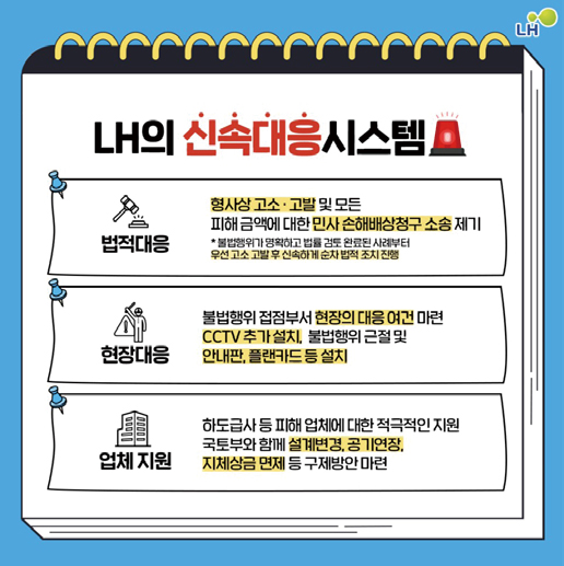 LH는 건설현장 불법행위 근절을 위해 전수조사 시행 및 신속한 대응 방안을 마련하고 있다. 크게 법적 대응, 현장대응, 업체 지원 3가지로 구분할 수 있다.