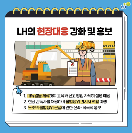 이를 시행하기 위해서는 현장대응 조치가 중요한 법이다. LH는 이와 관련해 매뉴얼을 제작해 불법행위 신고절차 등을 자세히 교육할 계획이며, LH 공사감독자는 노조의 불법행위 감시자로서의 역할을 충실히 이행할 계획이다.