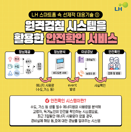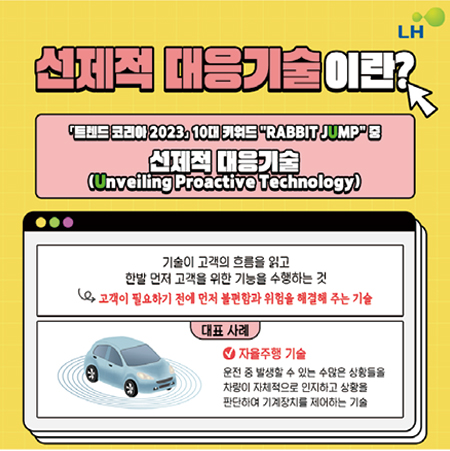 <2023 트렌드 코리아>에서 소개한 10개의 키워드 가운데 ‘선제적 대응기술’이 있다. 선제적 대응기술은 기술이 고객의 흐름을 읽고 한발 먼저 고객을 위한 기능을 수행하는 것이다. LH는 이미 선제적 대응기술을 적용하고 있다. 바로 ‘스마트홈 시스템’으로, 여기에 적용된 선제적 대응기술에는 어떤 것들이 있을까? 원격검침 시스템을 활용한 안전확인 서비스다. 수도, 가스 등 생활 필수 에너지원의 사용량을 분석해 고령자, 독거노인의 안전을 확인하는 시스템으로, 최근 3일 동안 에너지 사용량이 없을 경우, 경비실에 해당 동, 호를 경보로 알려준다.